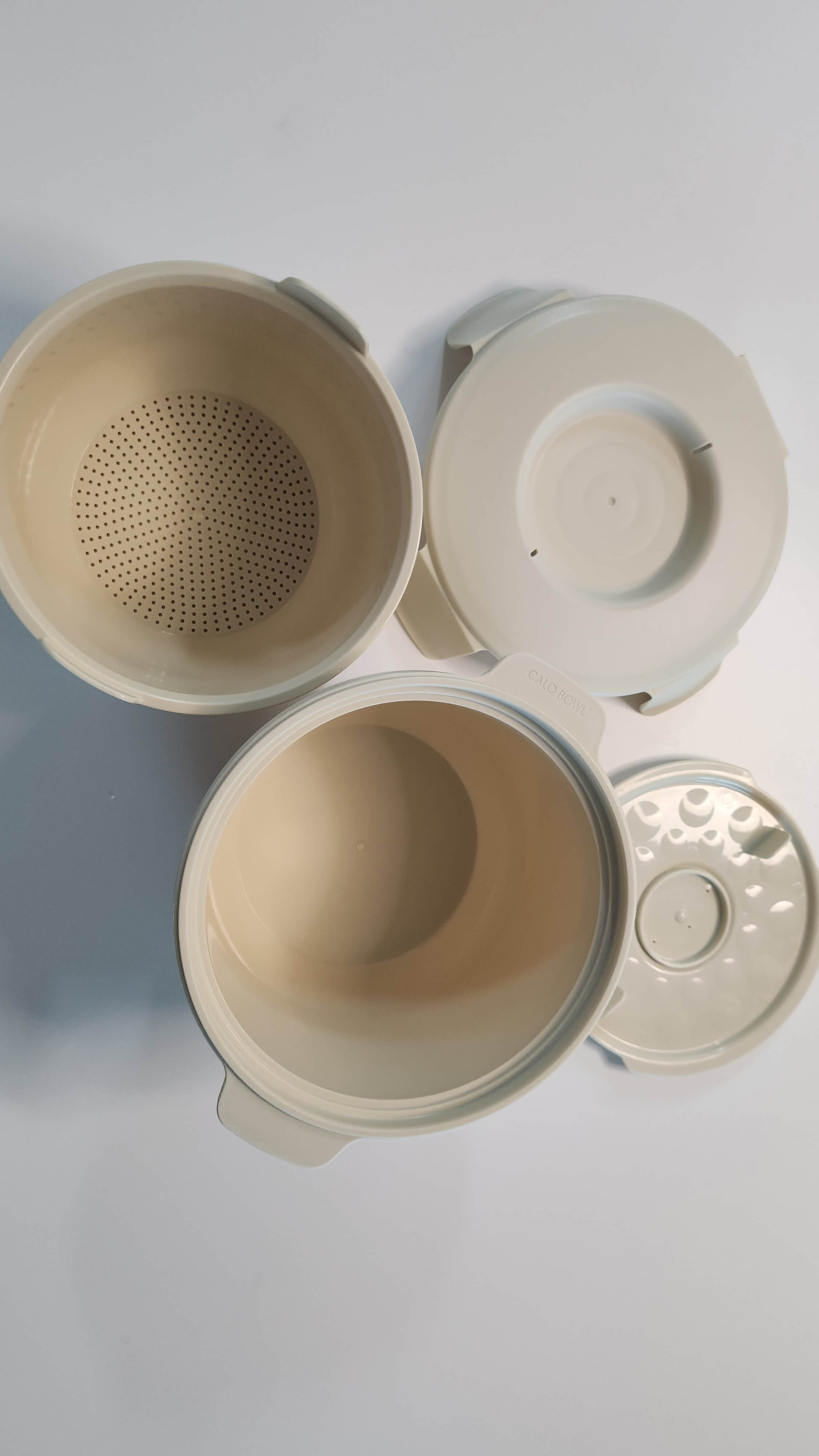 일단 이렇게 네 개가 한 세트입니다. 본체에 구멍이 숭숭 있는 내솥을 넣고 속뚜껑을 덮고 바깥 뚜껑을 덮어요.